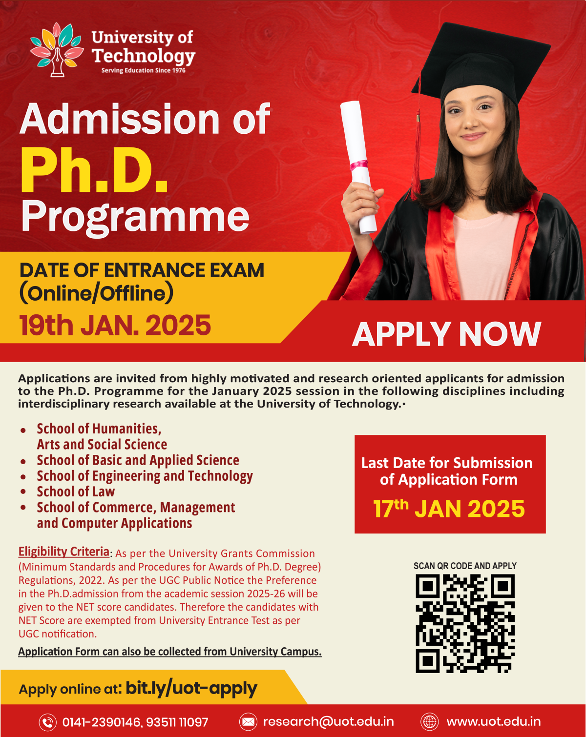 Hello students! we are glad to announce that, applications are invited from highly motivated and research oriented applicants for admission to the Ph.D. Programme for the Jan 2025 session including interdisciplinary research available at the University of Technology.