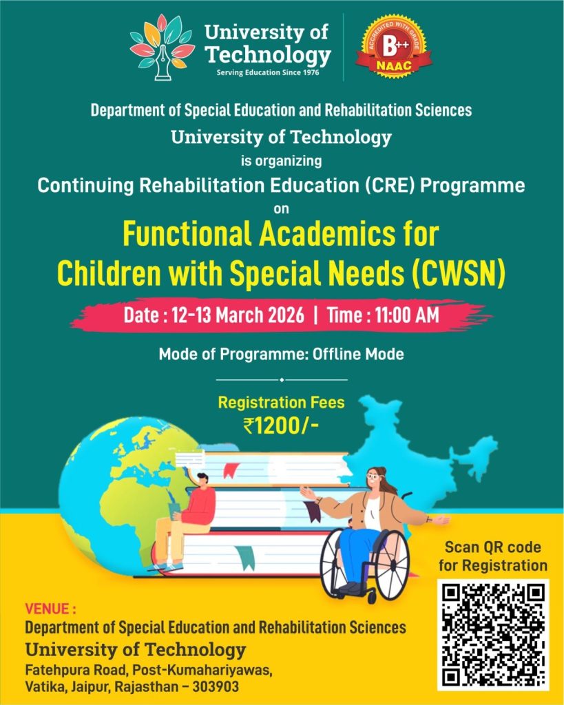 The Department of Special Education and Rehabilitation Sciences, University of Technology, Jaipur is organizing a Two-Day Zonal Level Continuing Rehabilitation Education (CRE) Programme in offline mode in the university campus.