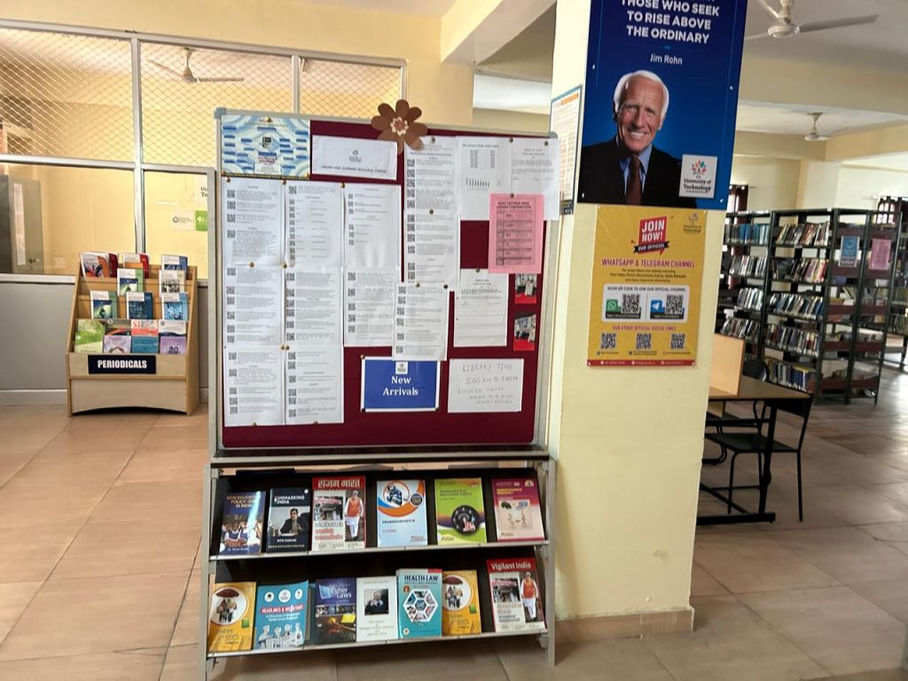 University of Technology flaunts a central library which happens to be the primary source of extended/additional knowledge providing specific course related materials or resources required for research/study for both students and faculty members. One can get access to a plethora of print as well as digital material – covering various streams and courses taught in the curriculum. The library also provides resources beyond the regular educational material keeping student interest in mind. Be it academic or research needs for students and staff members, central library houses a large number of hand-picked books, magazines, journals, writing software, news bulletins in addition to workshops conducted on several relevant and advanced topics for imparting more knowledge to individuals.