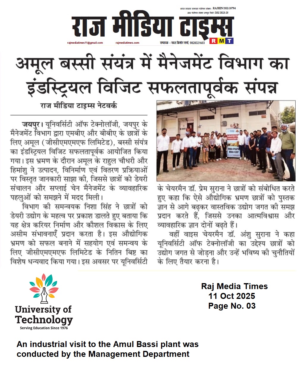 University of TechnologyPress Media- An industrial visit to the Amul Bassi plant was conducted by the Management Department