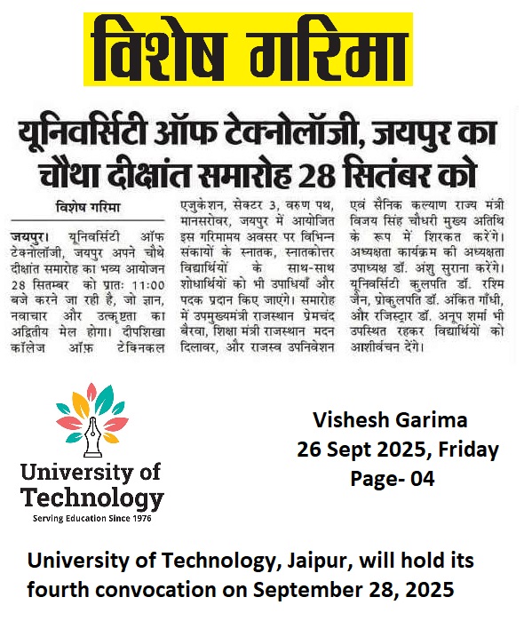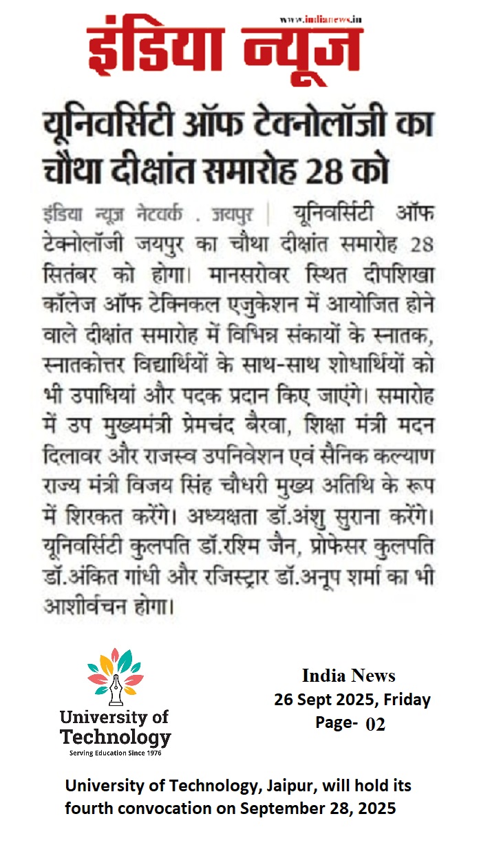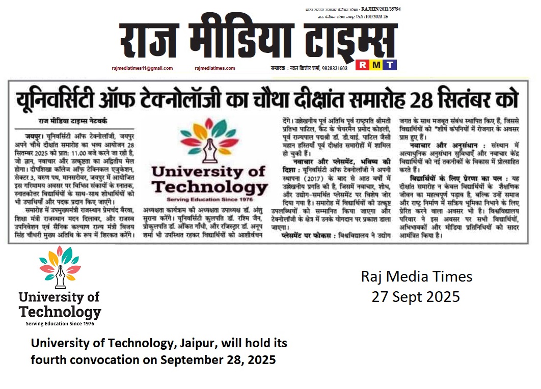 University of TechnologyPress Media Coverage- Fourth Convocation of the University of Technology, Jaipur, will be held on September 28, 2025