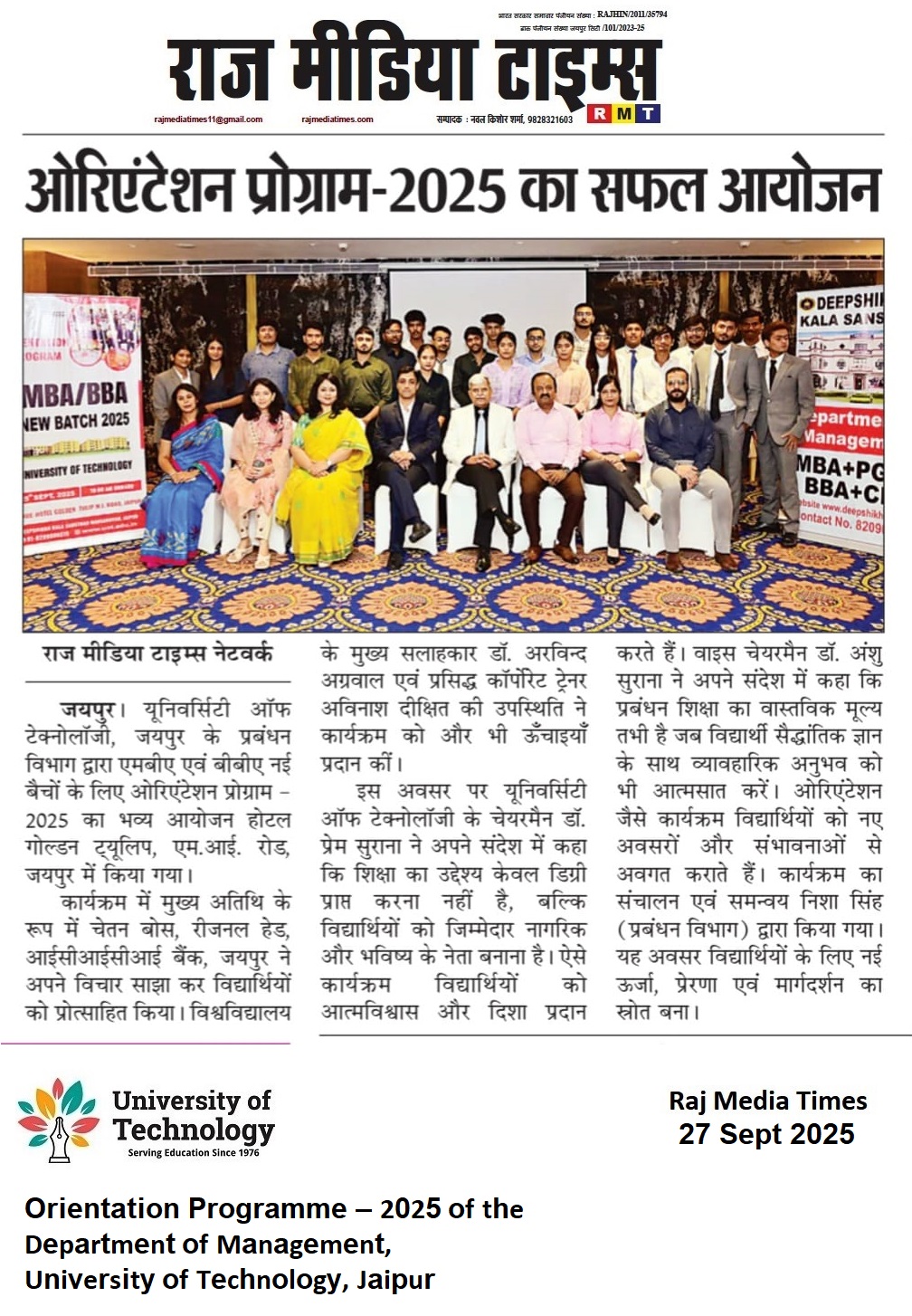University of TechnologyPress Media Coverage- Orientation Programme -2025 of the Department of Management, University of Technology, Jaipur