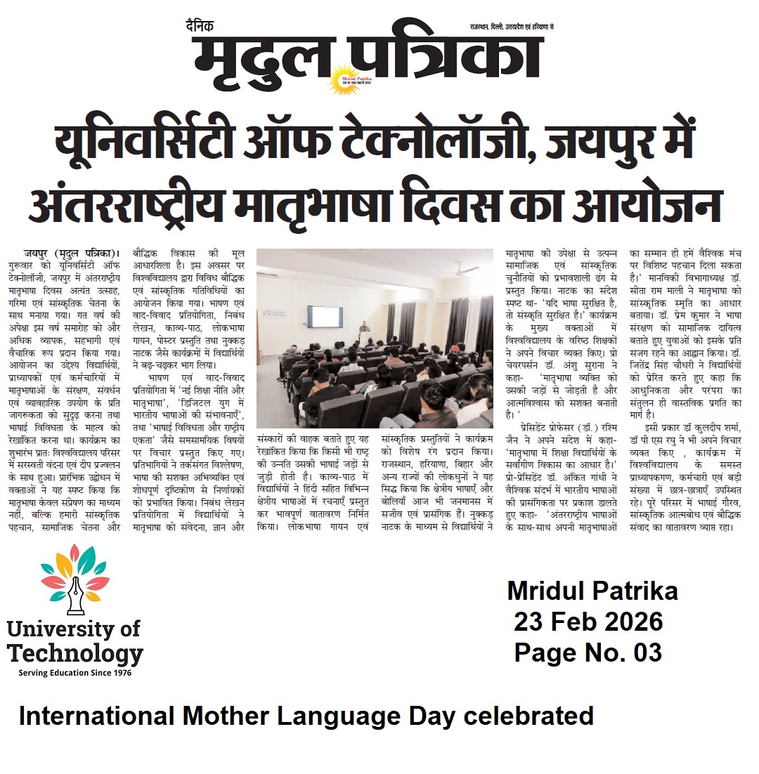 Global Confluence on Innovation, Research, and Education for Sustainable Futures (GCIRESF–2025) Placement Drive – Ecocat India Pvt Ltd Placement Drive – Samvardhana Motherson International Ltd Placement Drive – Pranav Vikas Placement Drive – PAYTM Placement Drive – PICL (India) Private Limited Placement Drive – PMT Exim Pvt Ltd Placement Drive- Fresher World Edu Tech Pvt Ltd Placement Drive – Axis Bank University of Technology, Jaipur – Fourth Convocation 2025 Announcement Admissions are open for Doctorate of Philosophy (PhD) July 2025 Notice for Examination May-June 2025 Notice for Examination Form 2025 University of Technology is now Official Publisher – Get Your Books Published Under a Trusted Name Golden Career Opportunity Awaiting – Exclusive Campus Drive by ACME Jaipur Notice for Examination Form – January 2025 Important Notice : Generate Your APAAR/ABC ID Mega Career Placement Drive For Engineering and Graduate Students Admissions are open for Doctorate of Philosophy (PhD) Jan 2025 International Conference on Digital Humanitarianism: Exploring the Role of Technology in Social Justice Movements Exciting Career Opportunity: Campus Drive at Krishna Maruti Ltd. Admissions are open for Doctorate of Philosophy (PhD) July 2024 Hiring Announcement for Dynamic Professionals at University of Technology Examination Notification Date Extension Campus Placement Opportunity For Diploma Students at ACME Jaipur Campus Drive Alert: Placement Opportunity For for B.Tech (CS/IT) Students Notice for Examination Form – May 2024 International conference on Interdisciplinary Research: Challenges and Opportunities ( ICIR-24) Admissions are open for Doctorate of Philosophy (PhD) Jan 2024 Notice for Examination Form – January 2024 Stay Connected With University of Technology: Join Our Official Channels Join One Day National Workshop on ‘Ethical Hacking’ by University of Technology Admissions are open for Doctorate of Philosophy (PhD) July 2023 – Vacant Seats University of Technology in association with Regional College is organizing a Campus Drive for Mahindra & Mahindra Tractor Jaipur Admissions are open for Doctorate of Philosophy (PhD) July 2023 3rd Convocation Ceremony | University Of Technology | 2023 Notice for Examination Form – June 2023 International workshop on “Application of Machine Learning and Artificial Intelligence in Research and Innovations”(IWMLAI-2023) Webinar on Intellectual Property Rights (IPR) International Conference Challenges & Opportunities in Future Research and Innovations (ICCOFRI-23) Admissions are open for Doctorate of Philosophy (PhD) January 2023 GOLDEN OPPORTUNITY! Get a chance to work with a renowned company Whizzard, A Mahindra Logistics Company. Read More To Know! We Are Happy To Announce That 100% Seats are Filled For Diploma In Education. Your trust is our responsibility. Extension of Last date of Submission of Exam Form is till 14th June 2022 (without late fee) Placement Drive in University of Technology! Join Webinar on “Art of writing Research Papers & Professional Ethics” and get the best advice by Prof. Dr.Abhijit Vyas. Important Notice- Fraud Alert! 2nd Convocation Ceremony | University Of Technology | 2022 Notice for Examination Form (January 2022) University of Technology joins hand with UpGrad Campus for better tomorrow. Association of Indian Universities Welcomed UOT As New Member! Notice for Examination Form (July 2021) Admission Open! Enrol Yourself in (Ph.D) Doctor Of Philosophy Course Programme. University has launched its E-Book “GK Mania” for May 2021. A Webinar Aiming at Combating COVID-19 With The Help Of Physiotherapy. University Of technology signs an MOU With Kutaisi University! Notice for Examination Form ( January 2021) Pre Ph.D. Entrance Test for a few vacant seats UNIVERSITY OF TECHNOLOGY IS ORGANIZING IT’S FIRST CONVOCATION CEREMONY. UOT Grievance Team is here to assist you. University Of Technology is Hiring! University of Technology announces admission to the Ph.D Program for eligible students. Inaugural Ceremony for Conference! UOT signs an MOU with ICSI! Congratulations to students for selection in the Online Placement Drive by Marelli Motherson Auto System Private Limited Notice for Examination Form P.hD. Entrance Exam 2020 Scheduled on 25th July 2020 Interactive session on the Impact of Communication on Career by Cambridge Language Assessment centre Live Webinar on Let’s Talk About Coronavirus Outbreak by Dr. Alok Mathur Online Placement drive by Marelli Motherson Auto System Private Limited for Polytechnic Diploma students Career Portal launched for students to facilitate the preparation of competitive examination Participate in the Online Quiz Contest on Information Practice Two Days Webinar on Future aspects of Computer Science Engineering 2 Days Live Online FDP on ICT tools for effective teaching and learning Students can participate in the Skill Enhancement Initiatives taken during COVID Lockdown Updated educational videos and notes are available to continue studies during the lockdown Download the Aarogya Setu App to combat against COVID-19 Crisis UOT initiated online learning facilities to continue studies during the lockdown period Suspension of Classes and other activities at the University of Technology to avoid the spread of Coronavirus (COVID-19) Fees Payments Beware of Fake Website and Fake Enrolments University of Technology Act Passed