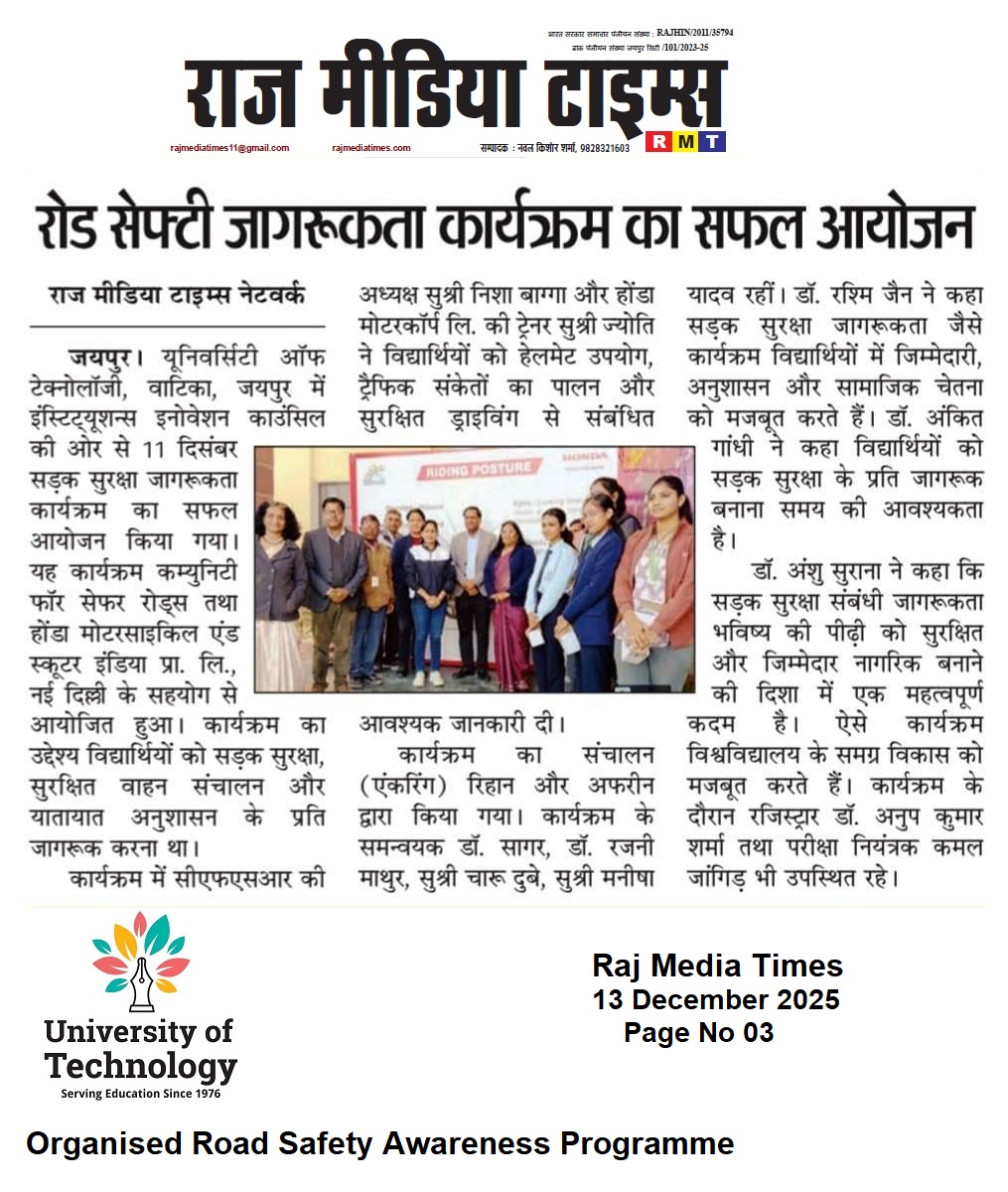 Global Confluence on Innovation, Research, and Education for Sustainable Futures (GCIRESF–2025) Placement Drive – Ecocat India Pvt Ltd Placement Drive – Samvardhana Motherson International Ltd Placement Drive – Pranav Vikas Placement Drive – PAYTM Placement Drive – PICL (India) Private Limited Placement Drive – PMT Exim Pvt Ltd Placement Drive- Fresher World Edu Tech Pvt Ltd Placement Drive – Axis Bank University of Technology, Jaipur – Fourth Convocation 2025 Announcement Admissions are open for Doctorate of Philosophy (PhD) July 2025 Notice for Examination May-June 2025 Notice for Examination Form 2025 University of Technology is now Official Publisher – Get Your Books Published Under a Trusted Name Golden Career Opportunity Awaiting – Exclusive Campus Drive by ACME Jaipur Notice for Examination Form – January 2025 Important Notice : Generate Your APAAR/ABC ID Mega Career Placement Drive For Engineering and Graduate Students Admissions are open for Doctorate of Philosophy (PhD) Jan 2025 International Conference on Digital Humanitarianism: Exploring the Role of Technology in Social Justice Movements Exciting Career Opportunity: Campus Drive at Krishna Maruti Ltd. Admissions are open for Doctorate of Philosophy (PhD) July 2024 Hiring Announcement for Dynamic Professionals at University of Technology Examination Notification Date Extension Campus Placement Opportunity For Diploma Students at ACME Jaipur Campus Drive Alert: Placement Opportunity For for B.Tech (CS/IT) Students Notice for Examination Form – May 2024 International conference on Interdisciplinary Research: Challenges and Opportunities ( ICIR-24) Admissions are open for Doctorate of Philosophy (PhD) Jan 2024 Notice for Examination Form – January 2024 Stay Connected With University of Technology: Join Our Official Channels Join One Day National Workshop on ‘Ethical Hacking’ by University of Technology Admissions are open for Doctorate of Philosophy (PhD) July 2023 – Vacant Seats University of Technology in association with Regional College is organizing a Campus Drive for Mahindra & Mahindra Tractor Jaipur Admissions are open for Doctorate of Philosophy (PhD) July 2023 3rd Convocation Ceremony | University Of Technology | 2023 Notice for Examination Form – June 2023 International workshop on “Application of Machine Learning and Artificial Intelligence in Research and Innovations”(IWMLAI-2023) Webinar on Intellectual Property Rights (IPR) International Conference Challenges & Opportunities in Future Research and Innovations (ICCOFRI-23) Admissions are open for Doctorate of Philosophy (PhD) January 2023 GOLDEN OPPORTUNITY! Get a chance to work with a renowned company Whizzard, A Mahindra Logistics Company. Read More To Know! We Are Happy To Announce That 100% Seats are Filled For Diploma In Education. Your trust is our responsibility. Extension of Last date of Submission of Exam Form is till 14th June 2022 (without late fee) Placement Drive in University of Technology! Join Webinar on “Art of writing Research Papers & Professional Ethics” and get the best advice by Prof. Dr.Abhijit Vyas. Important Notice- Fraud Alert! 2nd Convocation Ceremony | University Of Technology | 2022 Notice for Examination Form (January 2022) University of Technology joins hand with UpGrad Campus for better tomorrow. Association of Indian Universities Welcomed UOT As New Member! Notice for Examination Form (July 2021) Admission Open! Enrol Yourself in (Ph.D) Doctor Of Philosophy Course Programme. University has launched its E-Book “GK Mania” for May 2021. A Webinar Aiming at Combating COVID-19 With The Help Of Physiotherapy. University Of technology signs an MOU With Kutaisi University! Notice for Examination Form ( January 2021) Pre Ph.D. Entrance Test for a few vacant seats UNIVERSITY OF TECHNOLOGY IS ORGANIZING IT’S FIRST CONVOCATION CEREMONY. UOT Grievance Team is here to assist you. University Of Technology is Hiring! University of Technology announces admission to the Ph.D Program for eligible students. Inaugural Ceremony for Conference! UOT signs an MOU with ICSI! Congratulations to students for selection in the Online Placement Drive by Marelli Motherson Auto System Private Limited Notice for Examination Form P.hD. Entrance Exam 2020 Scheduled on 25th July 2020 Interactive session on the Impact of Communication on Career by Cambridge Language Assessment centre Live Webinar on Let’s Talk About Coronavirus Outbreak by Dr. Alok Mathur Online Placement drive by Marelli Motherson Auto System Private Limited for Polytechnic Diploma students Career Portal launched for students to facilitate the preparation of competitive examination Participate in the Online Quiz Contest on Information Practice Two Days Webinar on Future aspects of Computer Science Engineering 2 Days Live Online FDP on ICT tools for effective teaching and learning Webinar on Be Future Leader, Post COVID-19 Students can participate in the Skill Enhancement Initiatives taken during COVID Lockdown Updated educational videos and notes are available to continue studies during the lockdown Download the Aarogya Setu App to combat against COVID-19 Crisis UOT initiated online learning facilities to continue studies during the lockdown period Suspension of Classes and other activities at the University of Technology to avoid the spread of Coronavirus (COVID-19) Fees Payments P.hD. Entrance Exam 2019 Scheduled on 29th June 2019 Beware of Fake Website and Fake Enrolments University of Technology Act Passed