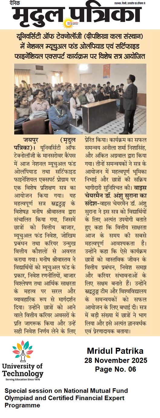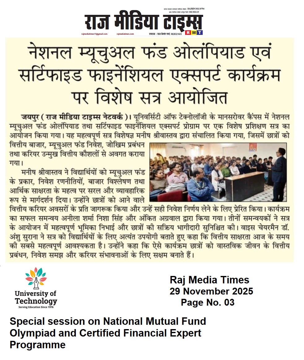 Global Confluence on Innovation, Research, and Education for Sustainable Futures (GCIRESF–2025) Placement Drive – Ecocat India Pvt Ltd Placement Drive – Samvardhana Motherson International Ltd Placement Drive – Pranav Vikas Placement Drive – PAYTM Placement Drive – PICL (India) Private Limited Placement Drive – PMT Exim Pvt Ltd Placement Drive- Fresher World Edu Tech Pvt Ltd Placement Drive – Axis Bank University of Technology, Jaipur – Fourth Convocation 2025 Announcement Admissions are open for Doctorate of Philosophy (PhD) July 2025 Notice for Examination May-June 2025 Notice for Examination Form 2025 University of Technology is now Official Publisher – Get Your Books Published Under a Trusted Name Golden Career Opportunity Awaiting – Exclusive Campus Drive by ACME Jaipur Notice for Examination Form – January 2025 Important Notice : Generate Your APAAR/ABC ID Mega Career Placement Drive For Engineering and Graduate Students Admissions are open for Doctorate of Philosophy (PhD) Jan 2025 International Conference on Digital Humanitarianism: Exploring the Role of Technology in Social Justice Movements Exciting Career Opportunity: Campus Drive at Krishna Maruti Ltd. Admissions are open for Doctorate of Philosophy (PhD) July 2024 Hiring Announcement for Dynamic Professionals at University of Technology Examination Notification Date Extension Campus Placement Opportunity For Diploma Students at ACME Jaipur Campus Drive Alert: Placement Opportunity For for B.Tech (CS/IT) Students Notice for Examination Form – May 2024 International conference on Interdisciplinary Research: Challenges and Opportunities ( ICIR-24) Admissions are open for Doctorate of Philosophy (PhD) Jan 2024 Notice for Examination Form – January 2024 Stay Connected With University of Technology: Join Our Official Channels Join One Day National Workshop on ‘Ethical Hacking’ by University of Technology Admissions are open for Doctorate of Philosophy (PhD) July 2023 – Vacant Seats University of Technology in association with Regional College is organizing a Campus Drive for Mahindra & Mahindra Tractor Jaipur Admissions are open for Doctorate of Philosophy (PhD) July 2023 3rd Convocation Ceremony | University Of Technology | 2023 Notice for Examination Form – June 2023 International workshop on “Application of Machine Learning and Artificial Intelligence in Research and Innovations”(IWMLAI-2023) Webinar on Intellectual Property Rights (IPR) International Conference Challenges & Opportunities in Future Research and Innovations (ICCOFRI-23) Admissions are open for Doctorate of Philosophy (PhD) January 2023 GOLDEN OPPORTUNITY! Get a chance to work with a renowned company Whizzard, A Mahindra Logistics Company. Read More To Know! We Are Happy To Announce That 100% Seats are Filled For Diploma In Education. Your trust is our responsibility. Extension of Last date of Submission of Exam Form is till 14th June 2022 (without late fee) Placement Drive in University of Technology! Join Webinar on “Art of writing Research Papers & Professional Ethics” and get the best advice by Prof. Dr.Abhijit Vyas. Important Notice- Fraud Alert! 2nd Convocation Ceremony | University Of Technology | 2022 Notice for Examination Form (January 2022) University of Technology joins hand with UpGrad Campus for better tomorrow. Association of Indian Universities Welcomed UOT As New Member! Notice for Examination Form (July 2021) Admission Open! Enrol Yourself in (Ph.D) Doctor Of Philosophy Course Programme. University has launched its E-Book “GK Mania” for May 2021. A Webinar Aiming at Combating COVID-19 With The Help Of Physiotherapy. University Of technology signs an MOU With Kutaisi University! Notice for Examination Form ( January 2021) Pre Ph.D. Entrance Test for a few vacant seats UNIVERSITY OF TECHNOLOGY IS ORGANIZING IT’S FIRST CONVOCATION CEREMONY. UOT Grievance Team is here to assist you. University Of Technology is Hiring! University of Technology announces admission to the Ph.D Program for eligible students. Inaugural Ceremony for Conference! UOT signs an MOU with ICSI! Congratulations to students for selection in the Online Placement Drive by Marelli Motherson Auto System Private Limited Notice for Examination Form P.hD. Entrance Exam 2020 Scheduled on 25th July 2020 Interactive session on the Impact of Communication on Career by Cambridge Language Assessment centre Live Webinar on Let’s Talk About Coronavirus Outbreak by Dr. Alok Mathur Online Placement drive by Marelli Motherson Auto System Private Limited for Polytechnic Diploma students Career Portal launched for students to facilitate the preparation of competitive examination Participate in the Online Quiz Contest on Information Practice Two Days Webinar on Future aspects of Computer Science Engineering 2 Days Live Online FDP on ICT tools for effective teaching and learning Webinar on Be Future Leader, Post COVID-19 Students can participate in the Skill Enhancement Initiatives taken during COVID Lockdown Updated educational videos and notes are available to continue studies during the lockdown Download the Aarogya Setu App to combat against COVID-19 Crisis UOT initiated online learning facilities to continue studies during the lockdown period Suspension of Classes and other activities at the University of Technology to avoid the spread of Coronavirus (COVID-19) Fees Payments P.hD. Entrance Exam 2019 Scheduled on 29th June 2019 Beware of Fake Website and Fake Enrolments University of Technology Act Passed